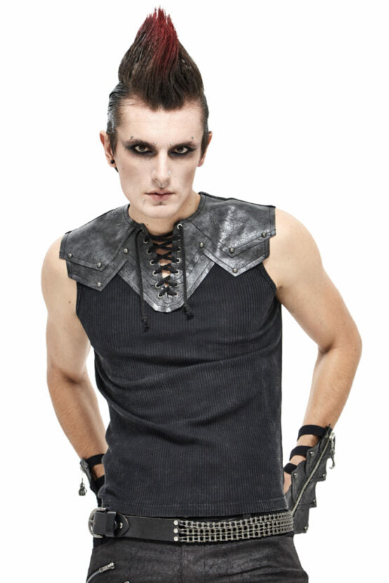 Black Tank top with a lace up collar and faux grey leather chest and shoulder armor