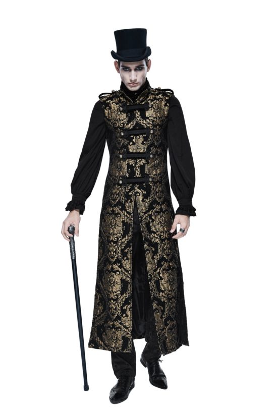 Gold & Black brocade damask military waistcoat. Black velvet epaulettes. Long vest with snap military style front for closure. Brocade fabric is perfect for a fancy masquerade or fantasy Victorian outing. $45 Rent