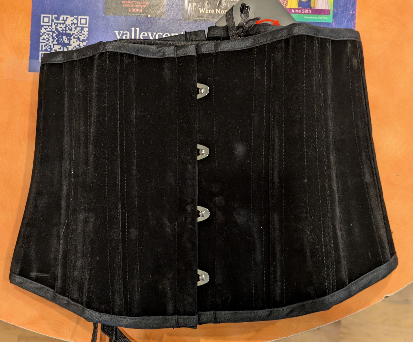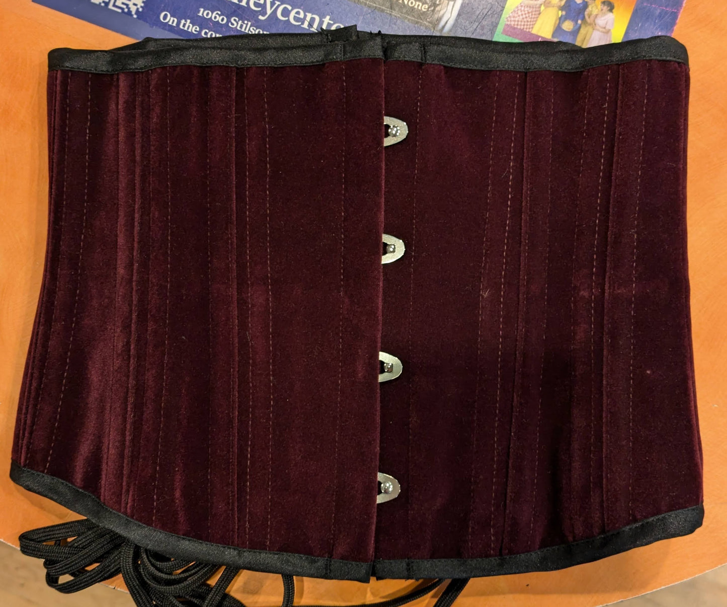 Velvet underbust corset waist cincher. Steel busk on front and plastic boning throughout. Full lace up back with a 4 inch modesty panel.