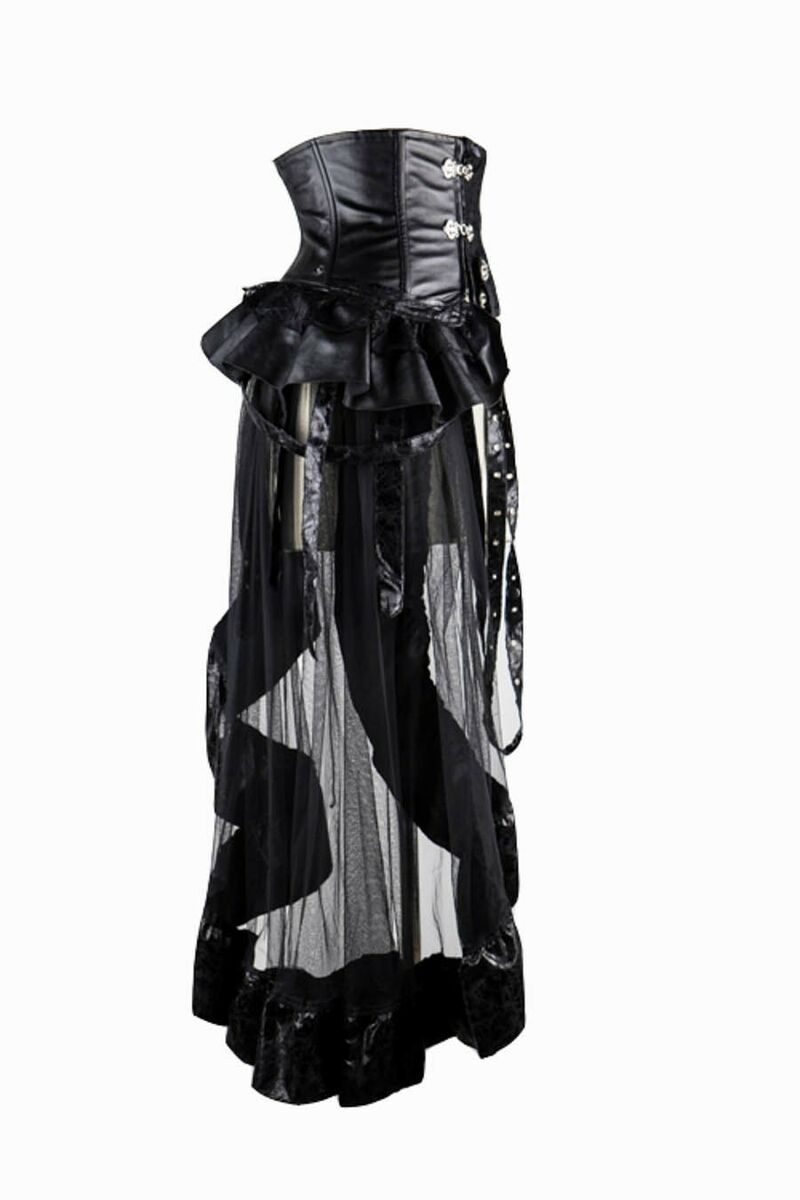 Asymmetrical punk corseted belt. Zip up front with clasps with a lace up back. Faux leather on one half of the corset and spider web lace on the other. Half bustle on one side of the corset, floor length mesh with lace and faux leather details.