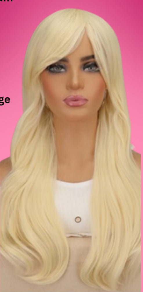 Vibrant blonde long wig with grown out bangs. Similar to barbie