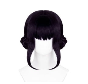 Short black wig with straight bangs with long bangs on the sides and two buns low buns one on either side of the head. Similar to K-Pop demon hunters. Comes with fishnet wig cap.